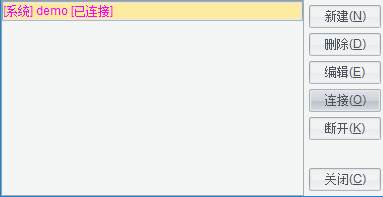 在打开数据源连接对话框中可以看到系统缺省demo数据源。选中demo数据源,点击右侧的【连接】按钮,连接成功的数据源呈粉色,并且连接状态由[未连接]变为[已连接]。如下图: