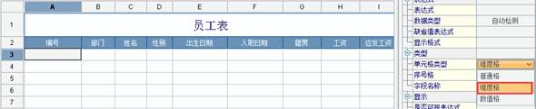 选中A3单元格,在右侧属性列表的字段名称中输入“employee.编号”。