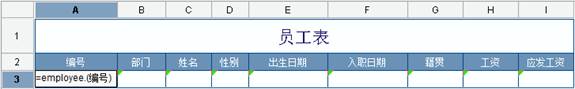数据来源:将填报表展现所需的数据通过对象名employee返回给填报表,在填报表单元格中就可以通过对象.字段名获取数据。