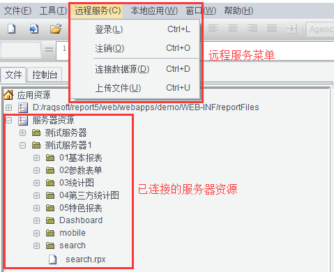 按照上述步骤配置完成后,重启润乾报表设计器,报表主菜单中会显示“远程服务”菜单,如下图: