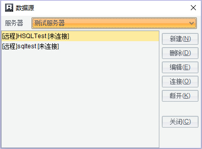 可以通过服务器下拉框选择需要打开的远程服务数据源,选中数据源可进行连接、断开、编辑、删除等操作,也可进行新建数据源的操作(其中新建、编辑、删除都可设置相关权限),具体权限设置可在自定义Server实现类中实现。