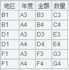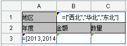 地区,年度,金额,数量组成一个序表,扩展后B1,A3,B3,C3单元格的值都是该序表的字段值;