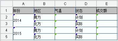数值格C2,C3,C4,C5对应的维度格的字段有:年份,地区