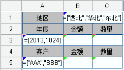 地区,客户,金额,数量组成一个序表,扩展后B1,A5,B5,C5单元格的值都是该序表的字段值。