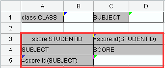 如图4.1.3-2为填报表sht文件的内容,当填报表引入4.1.3-1中的取数dfx后,在填报表的红色标记区域的任意一个普通格通过“score.”引入score序表。如果不希望变量名在普通格显示出来,可以给任意一个数值格设置字段名属性,比如为C5设置字段名称属性为“score.SCORE”。