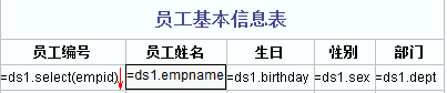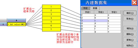 使用select函数相当于从数据集中取出一组符合条件的记录集合,在单元格中进行扩展,此时每个扩展出来的单元格都保留一个指针,在这些单元格的附属单元格中,应当直接用“数据集名.列名”来引用同一个数据集同一条记录的值,当列名包含特殊字符或列名为表达式时可使用“数据集名.field(fieldName)”获取。此时报表引擎不需要对数据集进行检索遍历了,而是直接从当前行中取值。