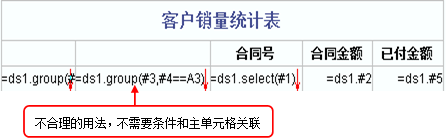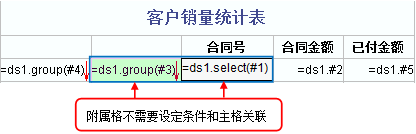 因此在附属单元格中,需要对该组集进行操作时,不需要用任何条件和主单元格关联了,如果加设了条件,反倒画蛇添足,导致报表引擎还对组集中的记录进行遍历检索。