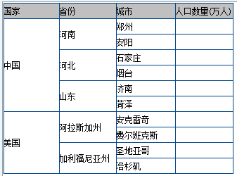 A2为维度格其维序列为["中国","美国"],纵向扩展,B2为维度格其维序列为[["河南","河北","山东"],["阿拉斯加州","加利福尼亚州"]],纵向扩展,C2为维度格其维序列为[[["郑州","安阳"],["石家庄","烟台"],["济南","菏泽"]],[["安克雷奇","费尔班克斯"],["圣地亚哥","洛杉矶"]]],纵向扩展,多层扩展直到D2是数值格为止,扩展结果如下图: