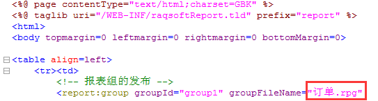 发布报表组到网页上只需要一个非常简单的jsp文件,通过<report:group>标签发布即可,如下图所示: