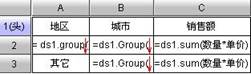 (4) 在B3单元格输入表达式:=ds1.group(城市,地区!='华东' and 地区!='华北';城市:1)