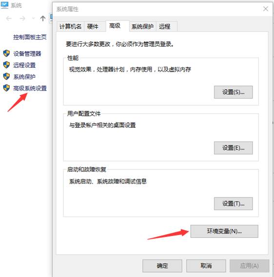 2.点击高级系统设置,弹出窗口后点击环境变量,再弹出如下窗口: