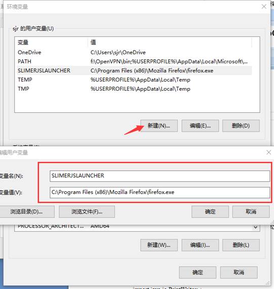 3.选择新建环境变量,在弹出窗口中设置变量名为SLIMERJSLAUNCHER,变量值为firefox的安装路径。