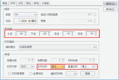 打开【报表属性】窗口,将【页边距】设为上边:20;下边:20;左边:10;右边10;【水平对齐】设为:靠左,【垂直对齐】设为:靠上。如图所示: