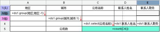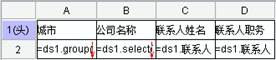 2, B2单元格中表达式为:=ds1.select(公司名称)