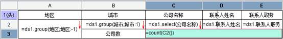 1, A2单元格中表达式为:=ds1.group(城市;城市:1)