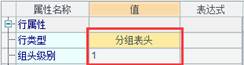 5、选中第二行,在属性栏中选择行类型为“分组表头”,设置组头级别为1。