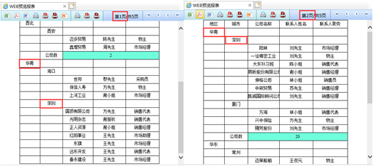 从上图发布报表的页面可以看到,左边是报表的第1页,分组地区为华南,分组城市为深圳的数据并没有在第1页展现完;右边是报表的第2页,第2页的前两行依然显示了分组表头,接着第1页展现该组的数据,这就是组表头重复的效果。