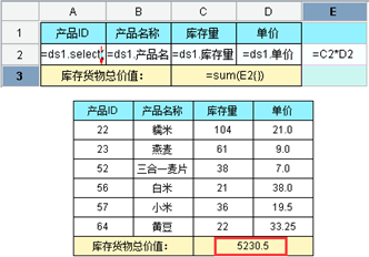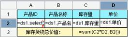 使用select函数从数据集ds1中选取产品ID字段列的所有值,该组字段值保留了一个指针,指向数据集中的源记录,因此在当前格的附属单元格里可直接通过dsn.colname表达式检索,如B2,C2等。