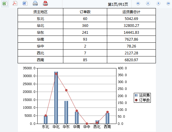 在这个图表中,柱表示运货费,线表示订单数。左侧纵轴为柱的纵坐标,右侧纵轴为线的纵坐标,柱和线共用下方横轴。