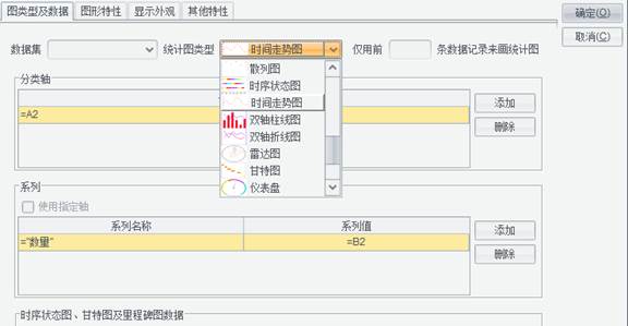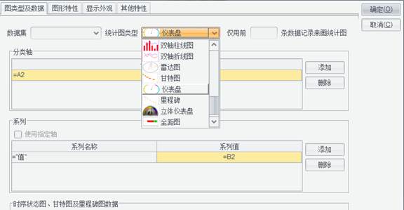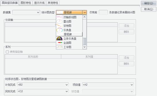高级统计图包括:双轴柱线图、双轴折线图、时间走势图、时序状态图、甘特图、仪表盘、立体仪表盘、雷达图、里程碑图、工字图、全距图。本节将重点介绍这几种高级统计图的具体使用方法,并附带一个实例。