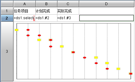 在这个图表中,横轴为时间,纵轴为任务项目,黄色方点为预期的完成时间,绿色圆点为实际的完成时间,从这个图可以直观的看出某个任务项目是否按期完成。