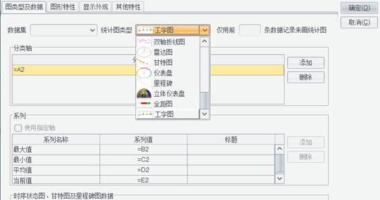 其中的分类轴即为图中的横轴定义,在添加了分类轴后,下方会自动添加四个系列,而且不能更改,因为这是工字图的规则。四个系列分别指定最大值、最小值、平均值和当前值,后面的系列标题就是系列显示在图表中的标签,可以随便取。
