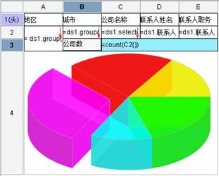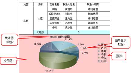 如下图所示,通过与饼形图相结合,了解分组报表中每个地区的公司个数占公司总个数的百分比: