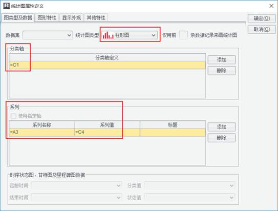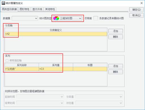 一个统计图一般只有一个分类轴定义,但有些统计图会有多个分类轴定义,此时点击一个分类轴时,下面的“系列”组框中显示的就是与它对应的系列定义。