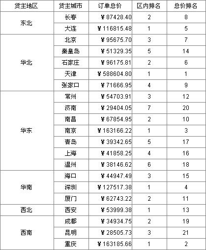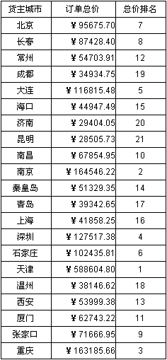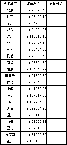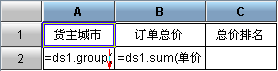 在该报表中C2格的内容为:=count(B2[`0]{B2>$B2})+1,该表达式是统计所有订单总价大于当前单元格订单总价的城市个数,然后加一,从而实现对订单总价排名的效果。