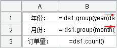 2, 在B2单元格输入表达式:= ds1.group(month(ds1.订购日期);month(ds1.订购日期):1)