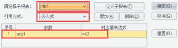 4, 在“请选择子报表”下拉框中选择我们刚才定义的子报表“rpt1”,并将【引入方式】设为“嵌入式”,同时增加子报表参数arg1,对应值表达式为:=A3,设置完成点【确定】按钮。