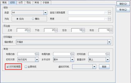 1、 在工具菜单中选择【报表】--【报表属性】,弹出报表属性窗口,选择【打印】标签,将【打印背景图】选中,如图所示: