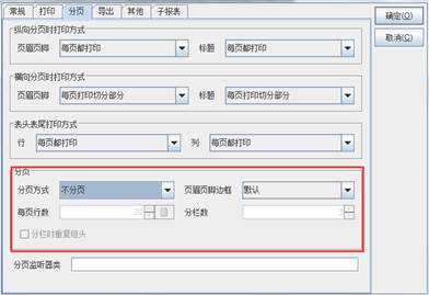 2、 选择【分页】标签,将【分页方式】设置为:不分页,点【确定】完成设置。如图所示: