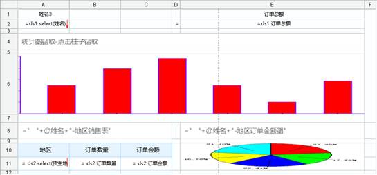 点击柱形图上的柱子时,通过使用超链接再次访问当前报表,同时将@legend/@category获取的当前所点击的柱子所在的系列值/分类值作为姓名参数值回传给报表。这样在展现报表时,地区销售表和地区订单金额图则会根据超链接所传递进来的不同姓名而变化。