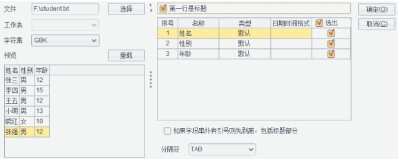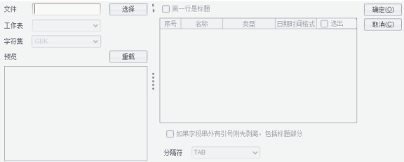4、 选择文件对应的【字符集】类型,默认是GBK。选择字段间的【分隔符】,默认是制表符(TAB)。