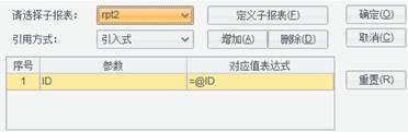 子报表定义完成后点【确定】按钮回到“子报表单元格属性定义”界面。在【请选择子报表】中选择我们刚才定义的子报表”rpt1”,并将【引入方式】设为”引入式”,点【增加】按钮,增加一个【参数】:ID,【对应值表达式】为:=@ID,点【确定】按钮。