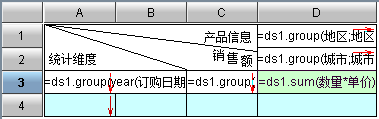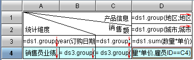 D4格中的表达式为:=ds1.sum(数量*单价,雇员ID==C4)。其含义是:雇员ID为C4单元格的雇员在D2城市的销售额;可以看出,这个表达式既和上表头D2格有关联,又和左表头C4格有关联,我们再看一下预览效果: