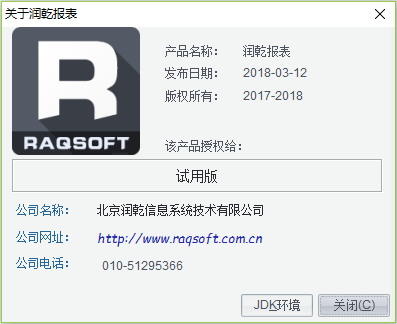 通过点击 帮助-关于,可以看到关于润乾报表的相关产品信息。如下图所示: