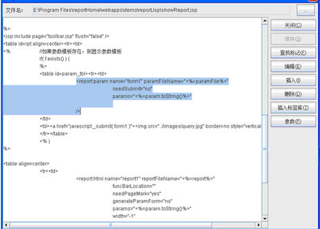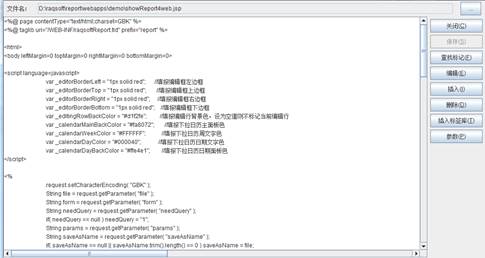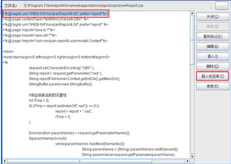 点击JSP编辑器中的【插入标签库】按钮,可以在JSP文件的头部插入“<%@ taglib uri="/WEB-INF/raqsoftReport.tld" prefix="report"%>”标签库。