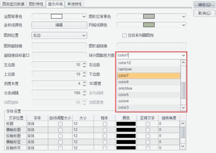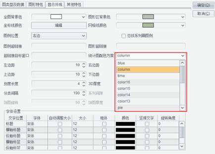 编辑完了统计图配色方案,我们就可以在统计图中使用它。点击菜单中的 报表-统计图打开统计图属性定义界面,切换到“显示外观”标签页,在“统计图配色方案”下拉框中可以选择统计图的配色方案。如下图所示: