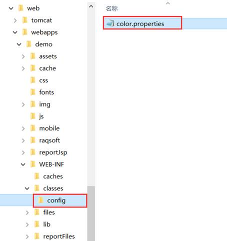 配色方案文件默认是存放在config文件夹中的,我们在设计器中预览报表时可以看到各种配色方案效果,但把报表发布到服务器上以后却只能看到默认配色方案效果。要想在服务器端看到我们编辑的各种配色方案效果,需要把配色方案文件color.properties拷贝到web根目录\WEB-INF\classes\config文件夹中就可以了。如下图所示: