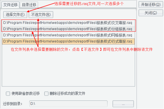 目录迁移可直接选择文件夹,对文件夹中的.raq文件和子目录中的.raq文件(可选)进行迁移。