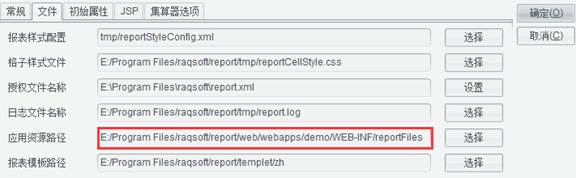 (1)在润乾报表设计器中启动内置的tomcat 上传时,上传路径为【工具】-【选项】-【文件】中设置的【应用资源路径】,需要注意的是当修改【应用资源路径】后,需要重启服务器才会生效。