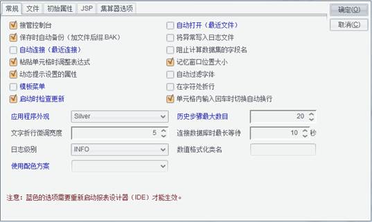是否打开设计器时,自动打开上次关闭设计器时最后一次打开的文件。如果该属性打勾了,那么下次重新打开设计器时,就自动的打开最近一次打开的报表文件,如果上次打开的文件不存在,则打开设计器时会有错误信息。如果该属性没有打勾,那么下次打开设计器时不会自动打开任何的报表文件。