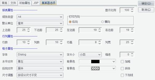 在选项配置窗口中切换到“初始属性”标签页,用于定义新建报表的报表属性、行列属性、格子属性等的默认值,如下图所示: