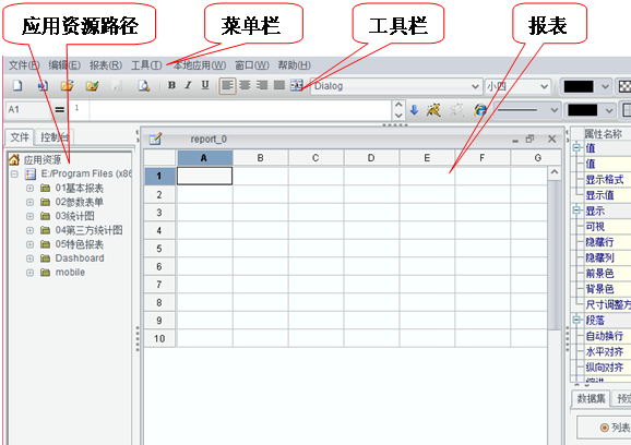 设计器由应用资源路径、菜单栏、工具栏、报表、属性、数据集等部分组成,如下图所示。